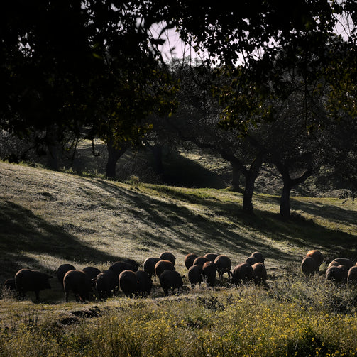 The 100% pure breed iberico piggies roam freely on the 'Dehesa' eating a mix of wild pasture grasses and acorns during the 'montanera season'